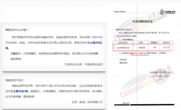 據(jù)了解,日前廣西壯族自治區(qū)華潤(rùn)、臺(tái)泥、路寶水泥等分別通知自3月25日起各品種水泥價(jià)格上調(diào)20元/噸。