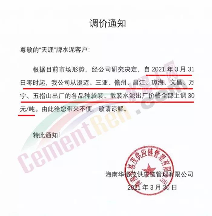 海南華裕茂供應(yīng)鏈管理有限公司通知自3月31日零時(shí)起,公司從澄邁、三亞、儋州、昌江、瓊海、文昌、萬(wàn)寧、五指山出廠的各品種袋裝、散裝水泥出廠價(jià)全部上調(diào)30元/噸。