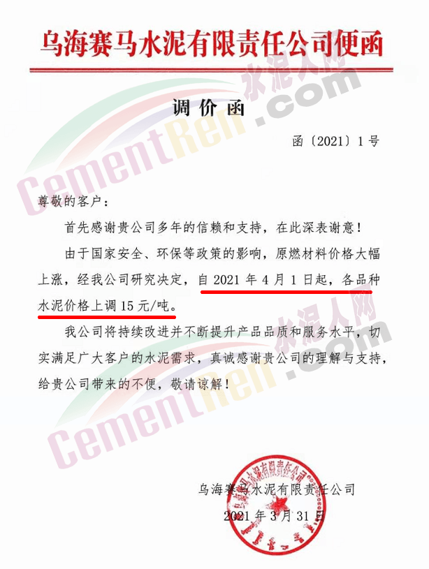 烏海賽馬水泥通知,自4月1日起各品種水泥上調(diào)15元/噸。