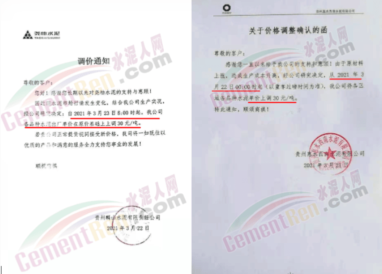 3月下旬貴州紫云西南水泥、惠水西南、華潤(rùn)水泥(安順)公司、臺(tái)泥(安順)公司、貴州超宇水泥、貴州麟山水泥通知上調(diào)水泥價(jià)格30元/噸。