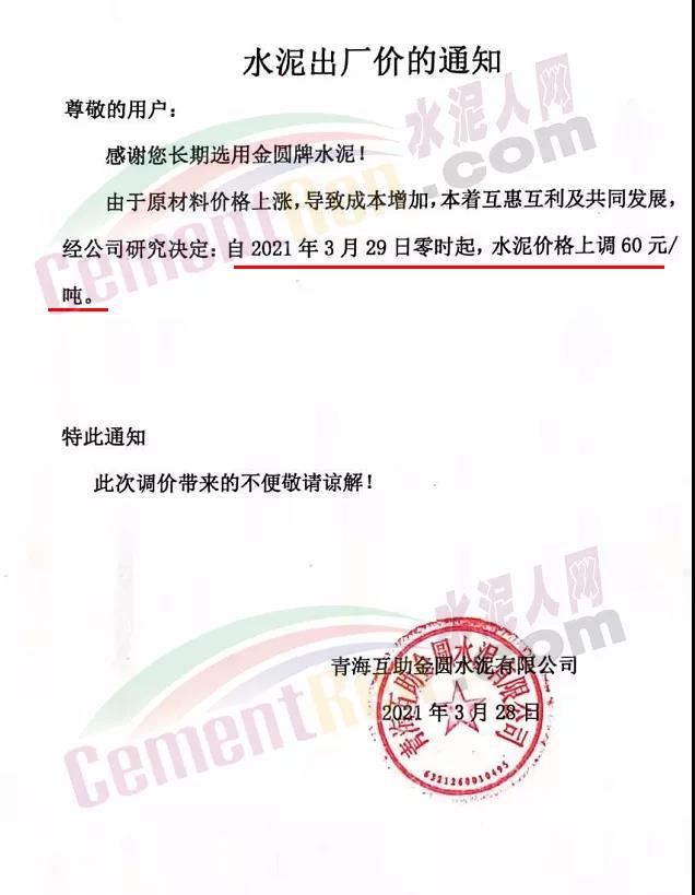 青?;ブ饒A水泥有限公司通知3月29日起水泥價(jià)格上調(diào)60元/噸。