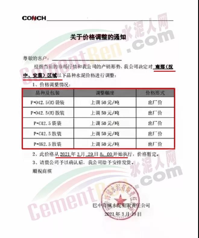 巴中海螺水泥有限責(zé)任公司通知,自3月29日起對(duì)南效(漢中、安康)區(qū)域高標(biāo)號(hào)水泥出廠價(jià)上調(diào)50元/噸。