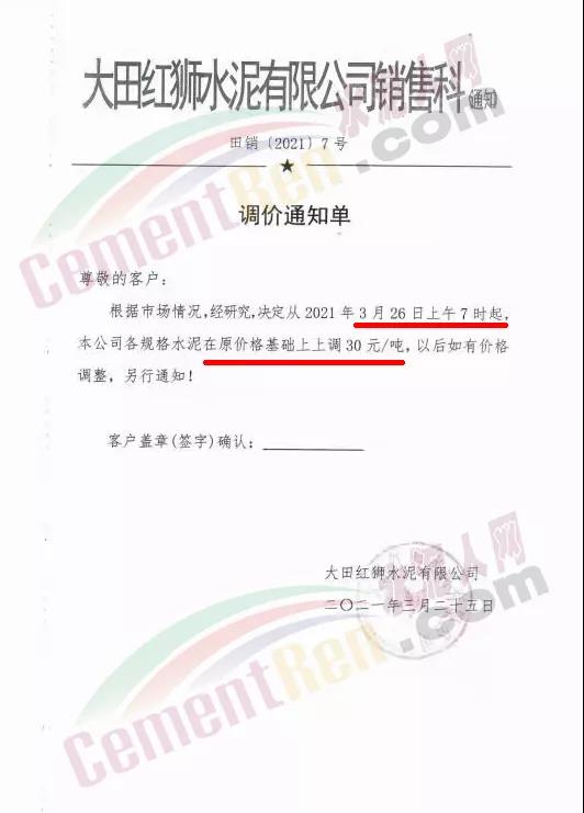 3月25日大田紅獅水泥通知自3月26日上午7時(shí)起,各規(guī)格水泥上調(diào)30元/噸。