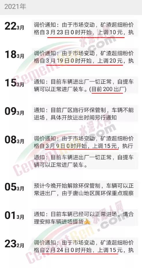 以唐山地區(qū)為例,礦渣細(xì)粉價(jià)格已經(jīng)連續(xù)四輪上漲,累計(jì)上調(diào)60元/噸。從唐山區(qū)域某礦粉經(jīng)銷售商近一個(gè)月的通知可見(jiàn)礦粉供應(yīng)日趨緊從2月下旬就開始了,目前的執(zhí)行價(jià)格已經(jīng)突破200元/噸。