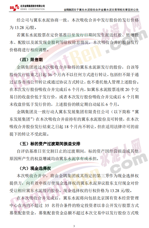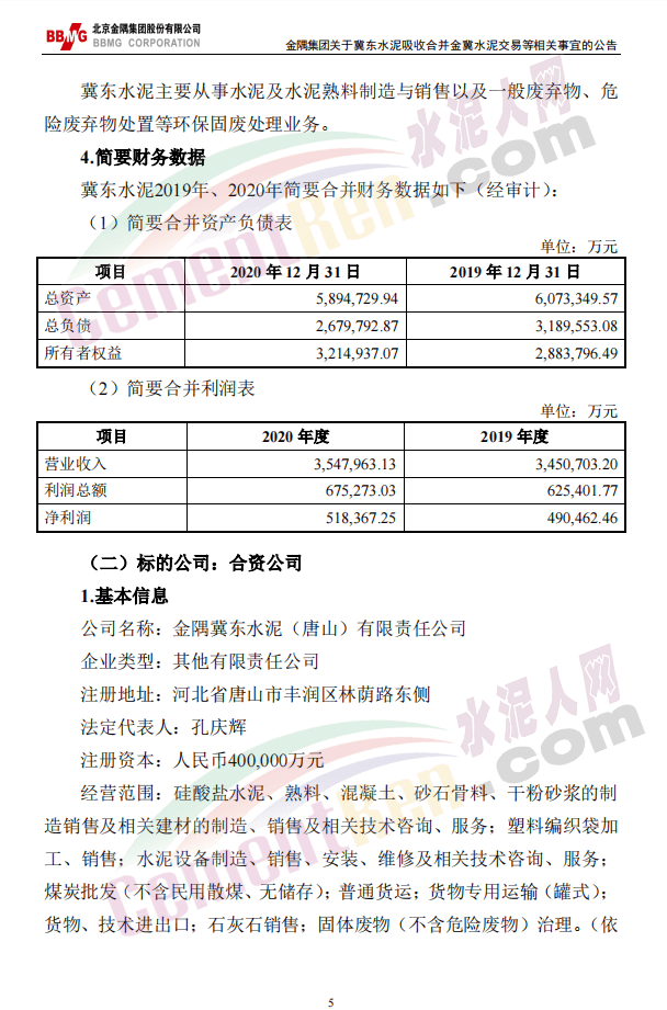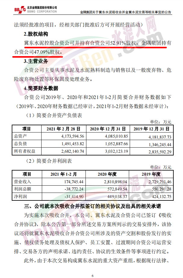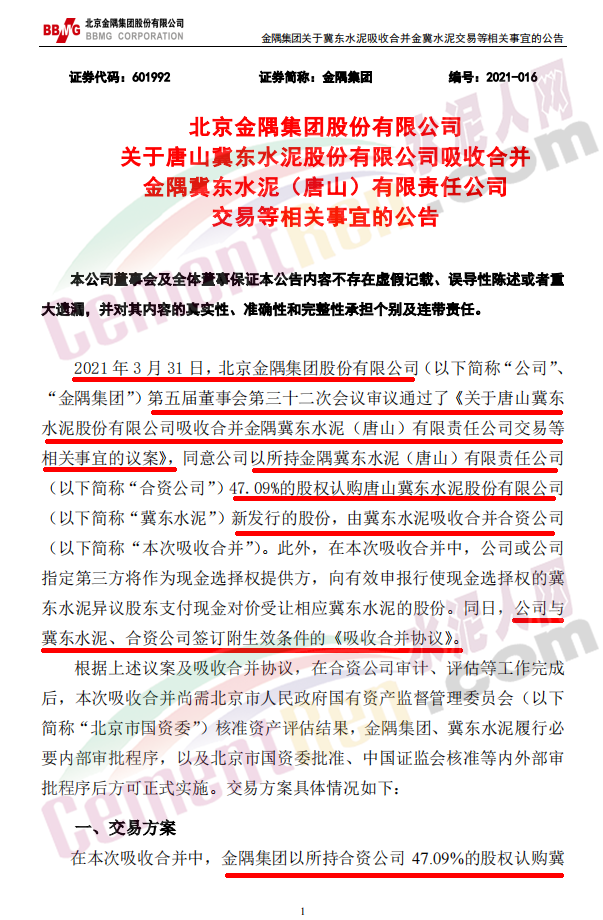 3月31日晚間,上市公司北京金隅集團股份有限公司發(fā)布《關(guān)于唐山冀東水泥股份有限公司吸收合并金隅冀東水泥(唐山)有限責任公司交易等相關(guān)事宜的公告》稱:2021年3月31日,北京金隅集團股份有限公司第五屆董事會第三十二次會議審議通過了《關(guān)于唐山冀東水泥股份有限公司吸收合并金隅冀東水泥(唐山)有限責任公司交易等相關(guān)事宜的議案》,同意公司以所持金隅冀東水泥(唐山)有限責任公司47.09%的股權(quán)認購唐山冀東水泥股份有限公司新發(fā)行的股份,由冀東水泥吸收合并合資公司。同日,公司與冀東水泥、合資公司簽訂附生效條件的《吸收合并協(xié)議》。