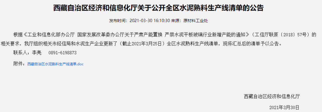 3月30日,西藏自治區(qū)經(jīng)濟(jì)和信息化廳發(fā)布《西藏自治區(qū)經(jīng)濟(jì)和信息化廳關(guān)于公開全區(qū)水泥熟料生產(chǎn)線清單的公告》稱,根據(jù)相關(guān)文件要求,西藏自治區(qū)經(jīng)信廳組織相關(guān)市經(jīng)信局和水泥生產(chǎn)企業(yè)更新了全區(qū)水泥熟料生產(chǎn)線清單,并將匯總后的清單予以公告。