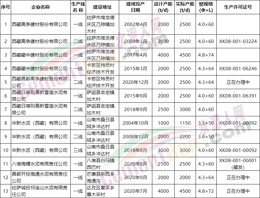 西藏自治區(qū)水泥熟料生產(chǎn)線清單顯示,包括西藏高爭、高新雪蓮、華新西藏、八宿海螺、昌都開投海通以及拉薩城投祁連山水泥在內(nèi)的13條熟料生產(chǎn)線,實際年產(chǎn)能達(dá)千萬噸以上。