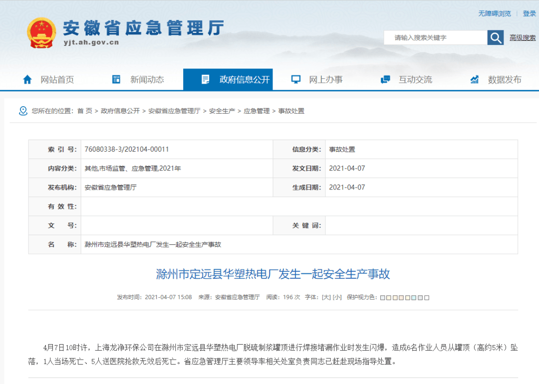 據(jù)安徽省應(yīng)急管理廳官網(wǎng)通報(bào),4月7日10時許,上海龍凈環(huán)保公司在滁州市定遠(yuǎn)縣華塑熱電廠脫硫制漿罐頂進(jìn)行焊接堵漏作業(yè)時發(fā)生閃爆,造成6名作業(yè)人員從罐頂(高約5米)墜落,1人當(dāng)場死亡、5人送醫(yī)院搶救無效后死亡。省應(yīng)急管理廳主要領(lǐng)導(dǎo)率相關(guān)處室負(fù)責(zé)同志已趕赴現(xiàn)場指導(dǎo)處置。