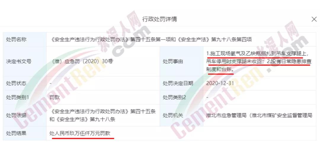 處罰日期:2020年12月31日;處罰結(jié)果:處人民幣玖萬伍仟萬元罰款;處罰事由:1.施工現(xiàn)場氧氣及乙炔瓶捆扎到吊車支撐腿上,吊車停用時支撐腿未收回;2.沒有日常隱患排查制度和臺賬。