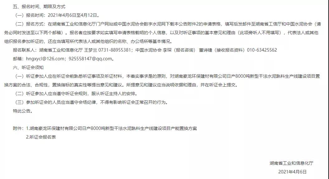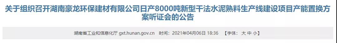 日前湖南省工信廳發(fā)布《關(guān)于組織召開湖南豪龍環(huán)保建材有限公司日產(chǎn)8000噸新型干法水泥熟料生產(chǎn)線建設(shè)項目產(chǎn)能置換方案聽證會的公告》稱,依據(jù)相關(guān)文件規(guī)定,擬組織召開湖南豪龍環(huán)保建材有限公司日產(chǎn)8000噸新型干法水泥熟料生產(chǎn)線建設(shè)項目產(chǎn)能置換方案聽證會。聽證時間,2021年4月,地點湖南省長沙市。詳情如下: