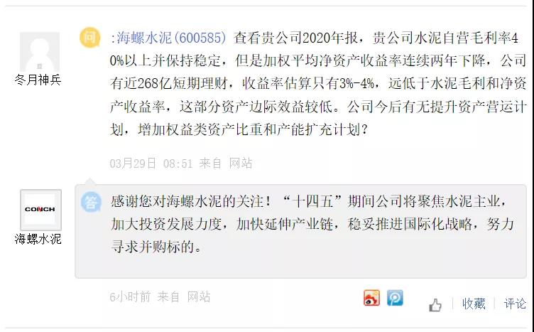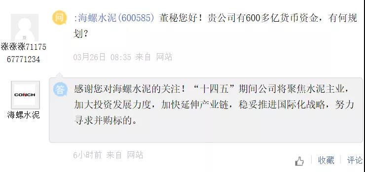 日前,有投資者在上市平向海螺水泥上市公司提出作為水泥行業(yè)龍頭公司,公司中長(zhǎng)期規(guī)劃和愿景?公司在科技進(jìn)步方面有無切入新型建材的研發(fā)規(guī)劃? 也有投資者提問,公司有600多億貨幣資金將如何規(guī)劃?今后是否有擴(kuò)充產(chǎn)能規(guī)劃等問題。