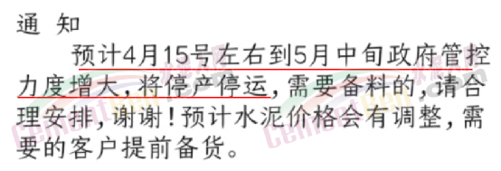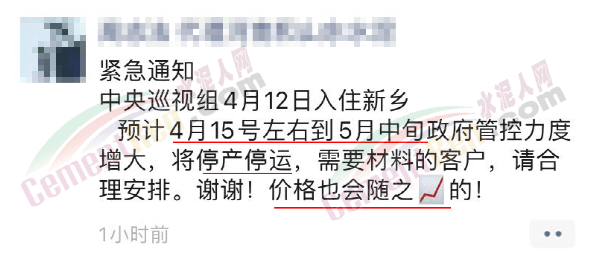 日前,有水泥經(jīng)銷商在社交平臺發(fā)布“緊急通知”稱,預計4月15日到5月中旬新鄉(xiāng)區(qū)域將停產(chǎn)停運,材料價格也會隨之上漲。