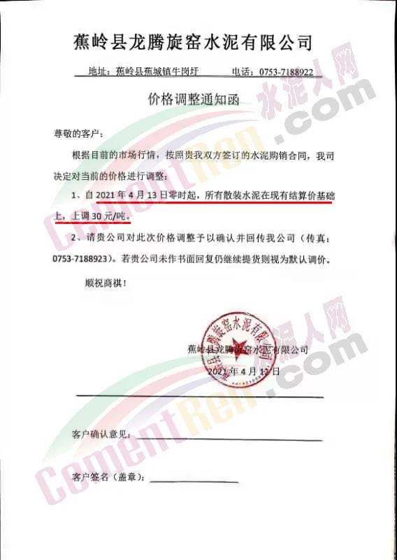 蕉嶺縣龍騰旋窯水泥有限公司通知自4月13日零時起,所有散裝水泥在現(xiàn)有結算價基礎上,上調30元/噸。