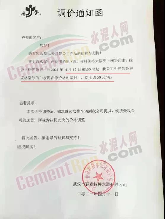 武漢市春森特種水泥有限公司通知,鑒于白水泥生產(chǎn)使用的原(燃)材料價格大幅度上漲等因素。經(jīng)公司研究決定,自4月12日8時起,公司生產(chǎn)的各種規(guī)格型號的白水泥在原價格的基礎上,均上調50元/噸。