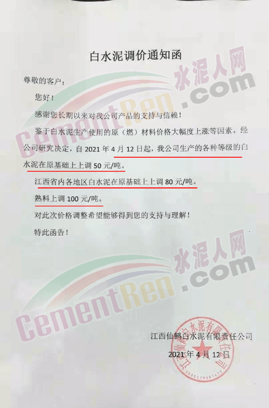 江西仙鶴白水泥有限責任公司通知鑒于白水泥生產(chǎn)使用的原(燃)材料價格大幅度上漲等因素。經(jīng)公司研究決定,自4月12日起,公司生產(chǎn)的各種等級的白水泥在原基礎上上調50元/噸。江西省內各地區(qū)白水泥在原基礎上上調 80元/噸,熟料上調100元/噸。