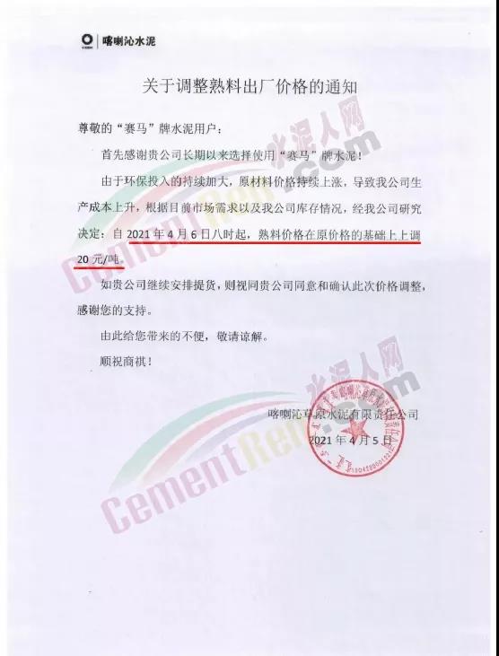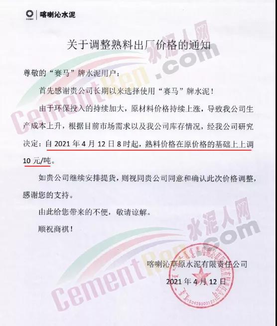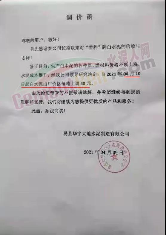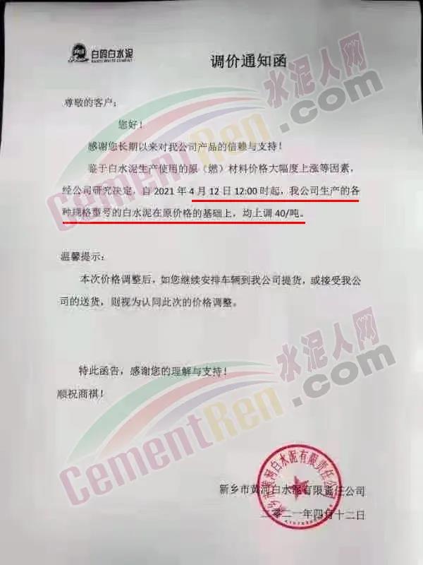 新鄉(xiāng)市黃河白水泥有限責任公司通知,鑒于白水泥生產(chǎn)使用的原(燃)材料價格大幅度上漲等因素,經(jīng)公司研究決定,自4月12日12時起,公司生產(chǎn)的各種規(guī)格型號時白水泥在原價格的基礎上,均上調40元/噸。