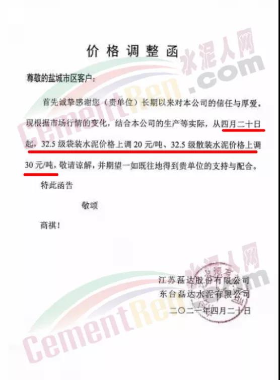江蘇磊達(dá)股份有限公司東臺磊達(dá)水泥有限公司通知從4月20日起,32.5級袋裝水泥價格上調(diào) 20元/噸,散裝水泥上調(diào)30元/噸。