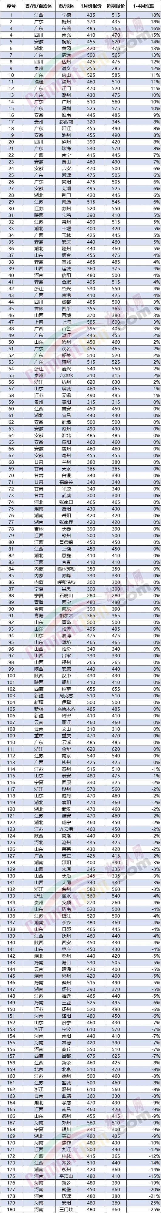 從水泥人網(wǎng)信息中心監(jiān)控?cái)?shù)據(jù)可見(jiàn),三十一個(gè)省市自治區(qū)年初至今絕大多數(shù)區(qū)域水泥價(jià)格處于下跌或持平,180個(gè)區(qū)域中有58個(gè)地區(qū)有1%~18%的漲幅,漲幅18%的區(qū)域?yàn)榻鲗幍潞蛷V東梅州地區(qū)。67個(gè)區(qū)域下跌1%~25%,下跌25%的為河南三門峽和安陽(yáng)地區(qū)。綜合來(lái)看,有將近70%的區(qū)域水泥價(jià)格出現(xiàn)波動(dòng),30%的區(qū)域水泥價(jià)格與1月份報(bào)價(jià)持平。價(jià)格波動(dòng)的區(qū)域中有一半以上的企業(yè)目前報(bào)價(jià)較1月份下跌。