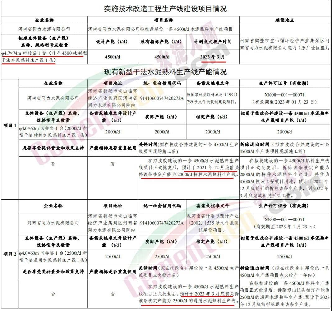 附件:河南省同力水泥有限公司擬技改建設一條4500t/d水泥熟料生產線項目有關產能情況