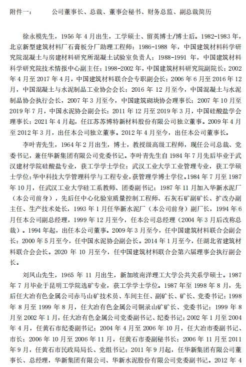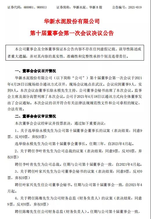 日前,華新水泥股份有限公司發(fā)布第十屆董事會第一次會議決議公告。稱,選舉徐永模先生為公司第十屆董事會董事長。任期三年,自2021年4月起。