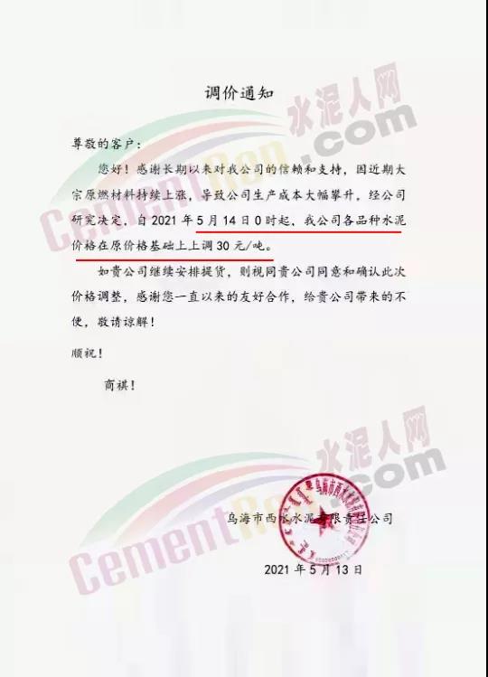 同日,烏海賽馬有限責(zé)任公司通知,因近期大宗原燃材料持續(xù)上漲,導(dǎo)致公司生產(chǎn)成本大幅攀升,經(jīng)公司研究決定,自2021年5月14日0時(shí)起,各品種水泥及油井水泥價(jià)格在原價(jià)格基礎(chǔ)上上調(diào)30元/噸。