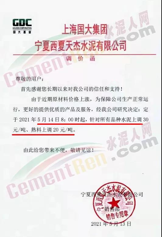 寧夏西夏天杰水泥有限公司通知,由于近期原材料價(jià)格上漲,為保障公司生產(chǎn)正常運(yùn)行,更好的提供優(yōu)質(zhì)的產(chǎn)品及服務(wù)。經(jīng)公司研究決定,于2021年5月14日8∶00時(shí)起,針對(duì)所有品種水泥上調(diào)30元/噸、熟料上調(diào)20元/噸。