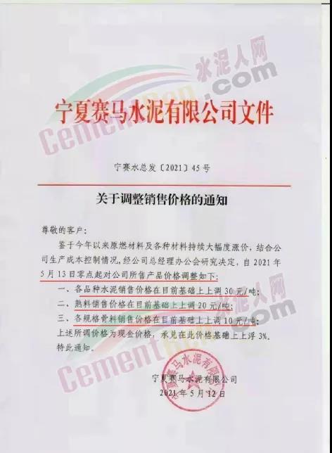 寧夏賽馬水泥通知,鑒于今年以來(lái)原燃材料及各種材料持續(xù)大幅度漲價(jià),結(jié)合公司生產(chǎn)成本控制情況,經(jīng)公司總經(jīng)理辦公會(huì)研究決定,自2021年5月13日零點(diǎn)起對(duì)公司所售各品種水泥上調(diào)30元/噸,熟料上調(diào)20元/噸,各規(guī)格骨料銷售價(jià)格上調(diào)10元/噸。上述所調(diào)價(jià)格為現(xiàn)金價(jià)格,承兌在此價(jià)格基礎(chǔ)上上浮3%。