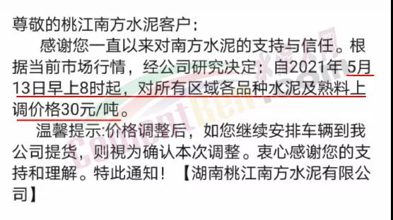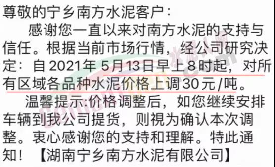 同期,湖南寧鄉(xiāng)南方水泥通知,根據(jù)當(dāng)前市場(chǎng)行情,經(jīng)公司研究決定自2021年5月13日早上8時(shí)起,對(duì)所有區(qū)域各品種水泥價(jià)格上調(diào)30元/噸。