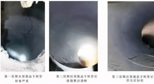 2020年10月份水泥窯檢修時發(fā)現(xiàn)整體微晶下料管內(nèi)沒有任何結(jié)皮,下料管的接口條紋清新可見,工程技術(shù)人員對此狀況驚嘆不已,當場決定不做任何修正繼續(xù)使用。又經(jīng)過第二窯期的運行至今年四月底,再次停窯后發(fā)現(xiàn)下料管仍完好如初,于是順利投入了第三個窯期的運行。