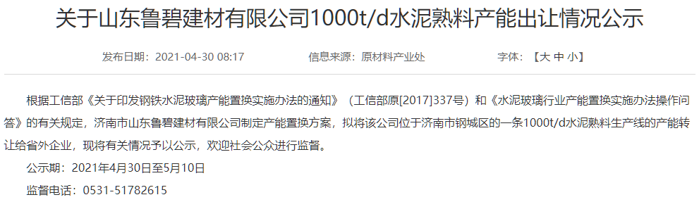 日前,山東省工業(yè)和信息化廳發(fā)布《關于山東泰西水泥有限公司水泥熟料產(chǎn)能出讓情況公示》稱,根據(jù)相關規(guī)定,擬將山東泰西水泥有限公司位于泰安市的一條1167t/d水泥熟料生產(chǎn)線的產(chǎn)能轉讓給省外企業(yè),具體公示如下: