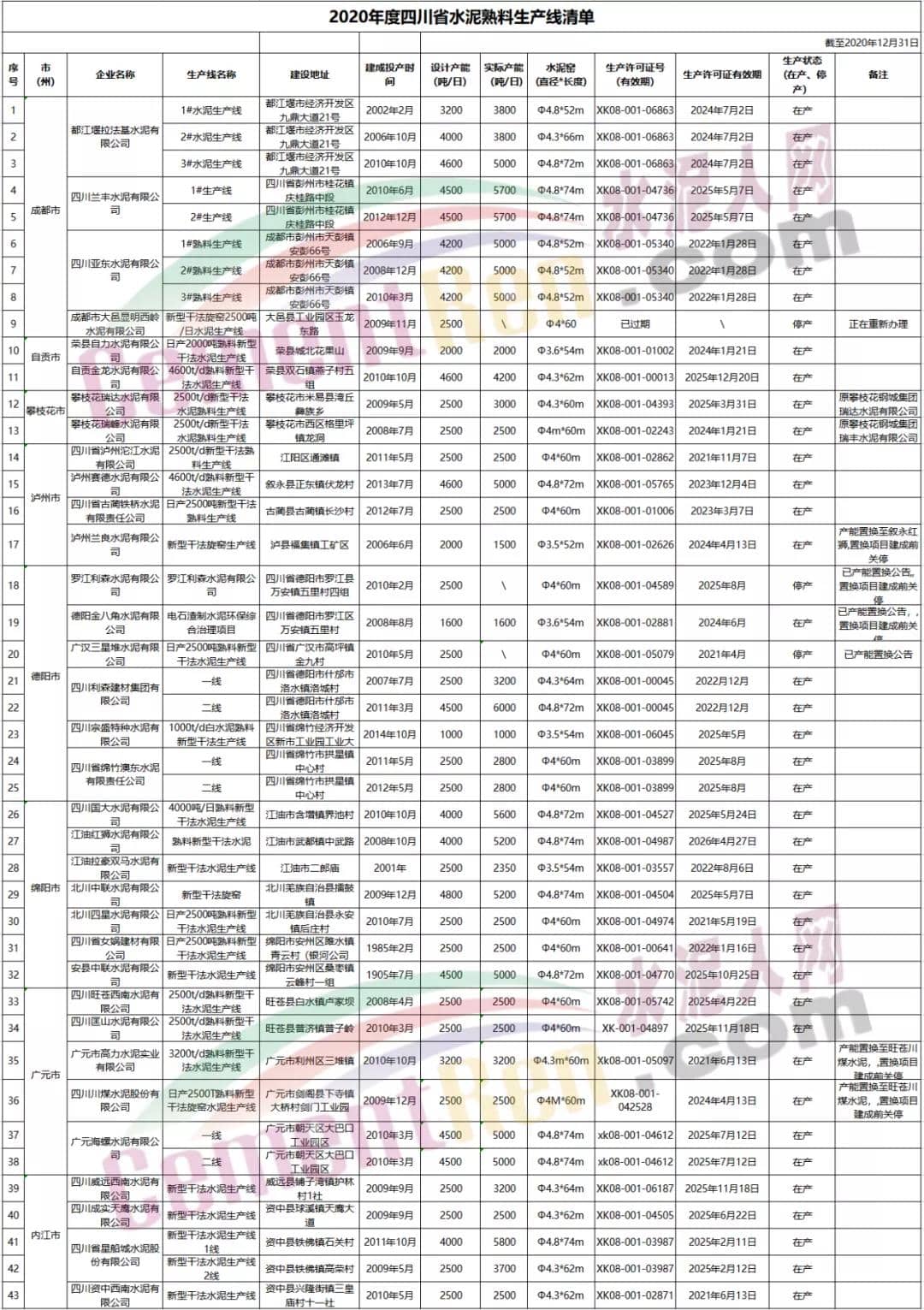 5月18日,四川省經(jīng)濟(jì)和信息化廳發(fā)布了《關(guān)于四川省水泥熟料和平板玻璃生產(chǎn)線清單的公示》,公示顯示,截止到2020年12月31日,四川省共有109條水泥熟料生產(chǎn)線,合計(jì)產(chǎn)能9921.93萬噸,其中10條停產(chǎn),1條在建。