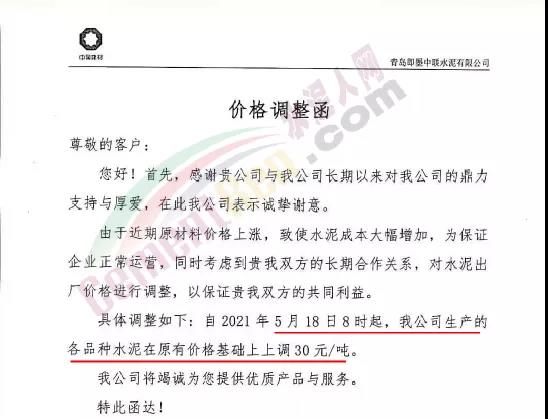 青島即墨中聯(lián)水泥有限公司通知,由于近期原材料價(jià)格上漲,致使水泥成本大幅增加。自5月18日8時(shí)起,公司生產(chǎn)的所有品種水泥在價(jià)格基礎(chǔ)上上調(diào) 30元/噸。