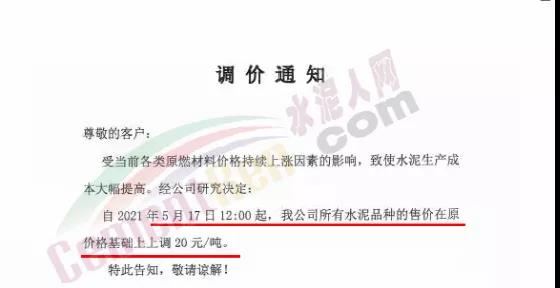 淄博魯中水泥通知,自5月17日中午12時(shí)起,所有水泥品種的售價(jià)在原價(jià)格基礎(chǔ)上上調(diào) 20元/噸。
