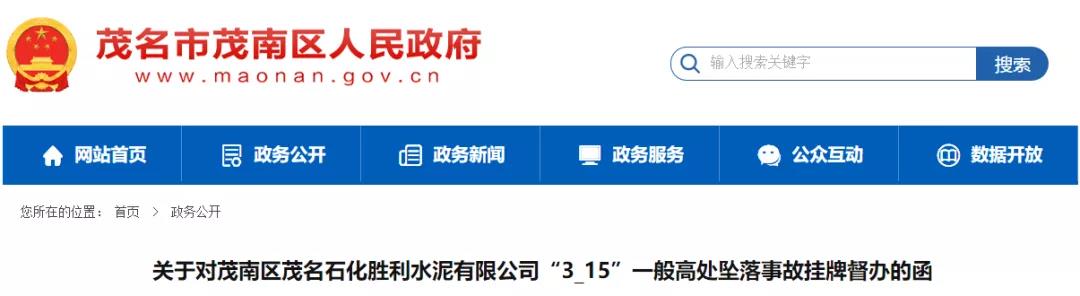 日前,廣東省茂名市茂南區(qū)人民政府發(fā)布《關(guān)于對(duì)茂南區(qū)茂名石化勝利水泥有限公司“3·15”一般高處墜落事故掛牌督辦的函》稱,根據(jù)相關(guān)通知要求,對(duì)茂南區(qū)茂名石化勝利水泥有限公司“3·15”一般高處墜落事故調(diào)查處理工作實(shí)行掛牌督辦。具體通知如下: