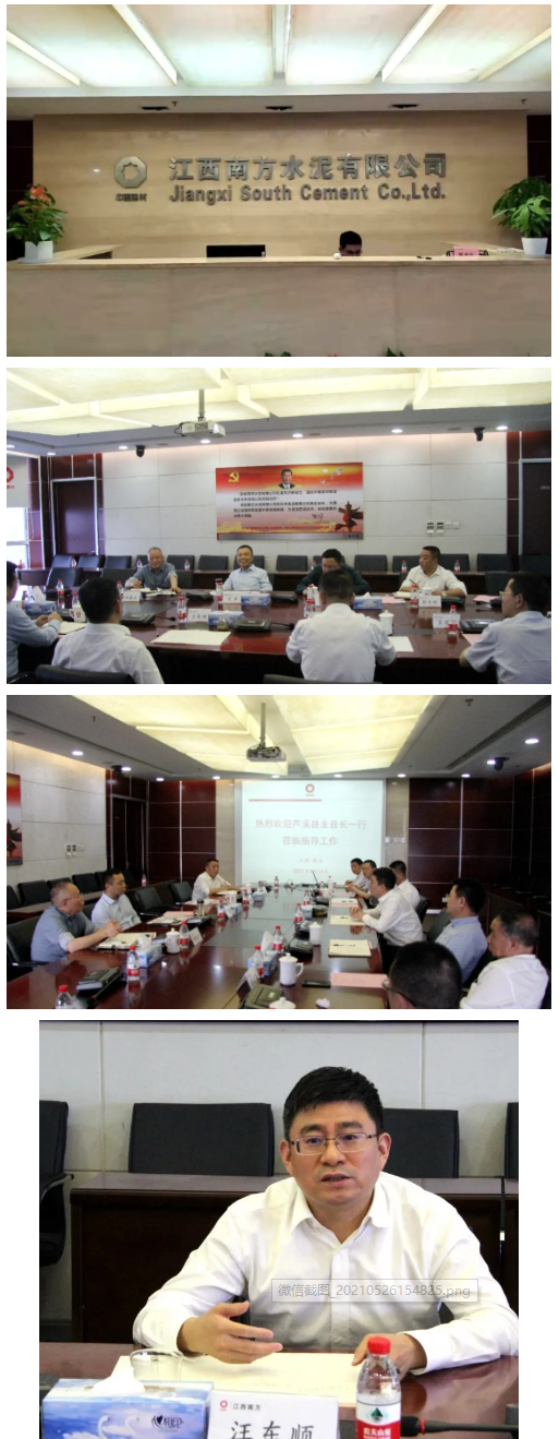 汪東順對龍萍一行前來考察洽談表示歡迎,感謝蘆溪縣委、縣政府對蘆溪南方水泥有限公司的大力支持。汪順東介紹了江西南方水泥有限公司在水泥熟料生產,商混混凝土,骨料生產等方面的基本情況,及公司“十四五”期間的發(fā)展規(guī)劃,并提出將加快推進蘆溪南方水泥項目在產能置換、可研初稿、企業(yè)入園等方面的工作。
