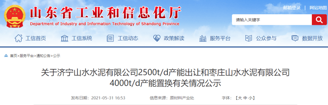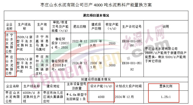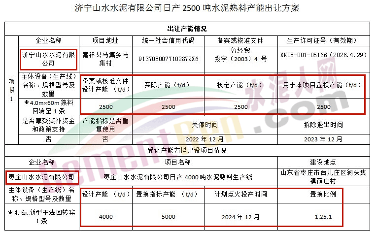 日前,山東省工業(yè)和信息化廳發(fā)布《關(guān)于濟(jì)寧山水水泥有限公司2500t/d產(chǎn)能出讓和棗莊山水水泥有限公司4000t/d產(chǎn)能置換有關(guān)情況公示》,公示期2021年5月31日至6月4日。產(chǎn)能出讓方案顯示,濟(jì)寧山水水泥、棗莊山水水泥分別退出2500t/d、3000t/d熟料生產(chǎn)線各一條,用于在山東棗莊市臺兒莊區(qū)新建一條4000t/d熟料生產(chǎn)線,新建生產(chǎn)線計(jì)劃點(diǎn)火投產(chǎn)時(shí)間為2024年12月,置換比例為1.25:1。詳情如下:
