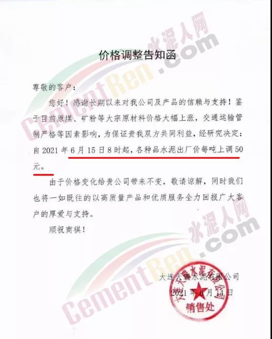 日前,大連天瑞水泥有限公司通知稱,鑒于目前原煤、礦粉等大宗原材料價格大幅上漲,交通運輸管制嚴格等因素影響,經(jīng)研究決定自6月15日8時起,各品種水泥出廠價上調(diào)50元/噸。