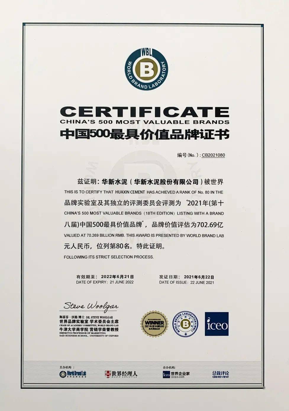 6月22日,由世界品牌實(shí)驗(yàn)室(WorldBrandLab)主辦的第十八屆“世界品牌大會”在北京舉行,會上發(fā)布了2021年《中國500最具價(jià)值品牌》榜單,華新水泥以702.69億元的品牌價(jià)值位列榜單第80位,較去年上漲了103.94億元,這是華新連續(xù)第九年上榜。