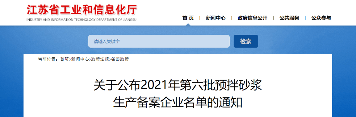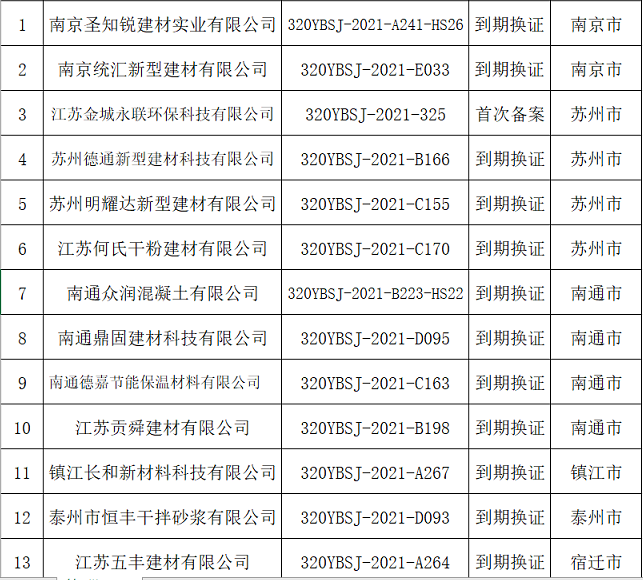 根據(jù)《江蘇省散裝水泥促進(jìn)條例》《江蘇省預(yù)拌砂漿生產(chǎn)企業(yè)備案管理辦法》(蘇經(jīng)信節(jié)能〔2010〕1130號(hào))和《關(guān)于進(jìn)一步做好全省預(yù)拌砂漿生產(chǎn)企業(yè)備案工作的通知》(蘇散字〔2015〕20號(hào))有關(guān)規(guī)定,有關(guān)設(shè)區(qū)市散裝水泥行政主管部門組織了轄區(qū)內(nèi)申報(bào)企業(yè)的現(xiàn)場(chǎng)檢查或資料審核,南京圣知銳建材實(shí)業(yè)有限公司等13家單位符合預(yù)拌砂漿生產(chǎn)企業(yè)備案條件。經(jīng)復(fù)核,同意該13家單位為2021年第六批預(yù)拌砂漿生產(chǎn)備案企業(yè)并向社會(huì)公布。