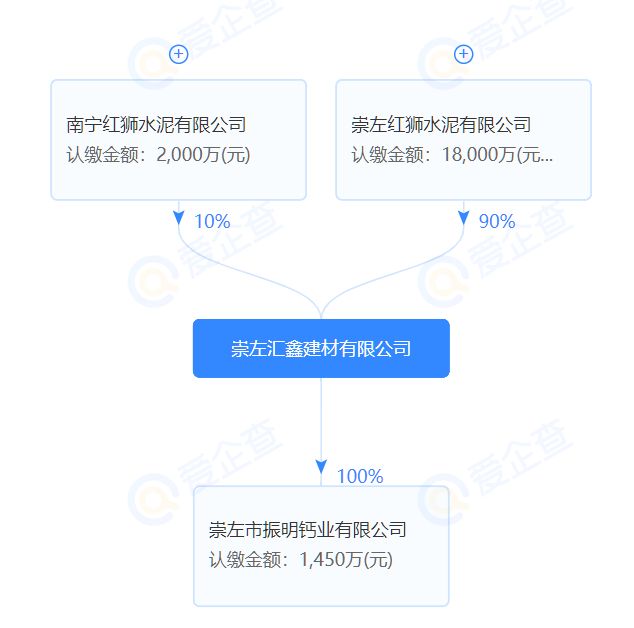 據(jù)了解,崇左匯鑫建材為紅獅控股集團(tuán)旗下企業(yè),其中崇左紅獅水泥擁有其90%股份,南京紅獅水泥擁有其10%股份。