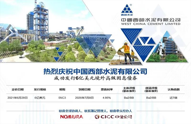 2021年6月29日,經(jīng)過2個月的緊張籌備,中國西部水泥有限公司成功確認定價,發(fā)行了6億美元境外高級固息債券,期限5年,利率4.95%。