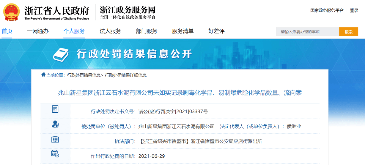日前,浙江省人民政府政務(wù)服務(wù)網(wǎng),通報(bào)了兆山新星集團(tuán)浙江云石水泥有限公司未如實(shí)記錄劇毒化學(xué)品、易制爆危險(xiǎn)化學(xué)品數(shù)量、流向案。