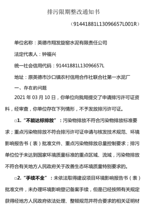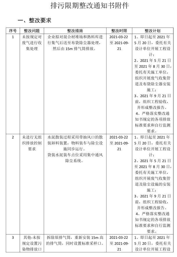 其中,今年3月30日下達(dá)限期整改的廣東清遠(yuǎn)英德市翔發(fā)旋窯水泥有限責(zé)任公司整改問(wèn)題為“未按規(guī)定對(duì)廢氣進(jìn)行收集處理、未進(jìn)行無(wú)組織排放控制要求、其他-未按規(guī)定設(shè)置污染物排放口、未完成自主驗(yàn)收手續(xù)”等。企業(yè)整改措施、整改計(jì)劃如下: