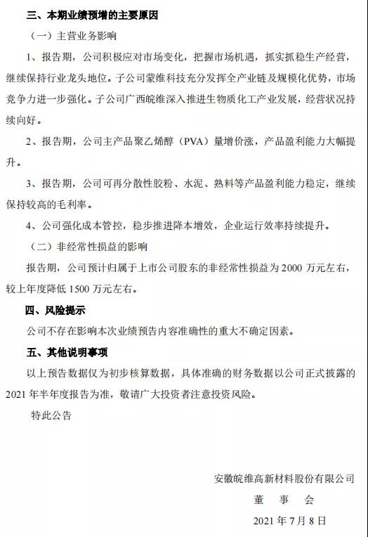 7月7日,皖維高新(600063)發(fā)布2021年半年度業(yè)績(jī)預(yù)告:預(yù)計(jì)2021年半年度公司實(shí)現(xiàn)歸屬于上市公司股東的凈利潤(rùn)為4.5億元到5億元,與上年同期相比增加2.3億元到2.8億元,同比增長(zhǎng)112.66%到136.29%。