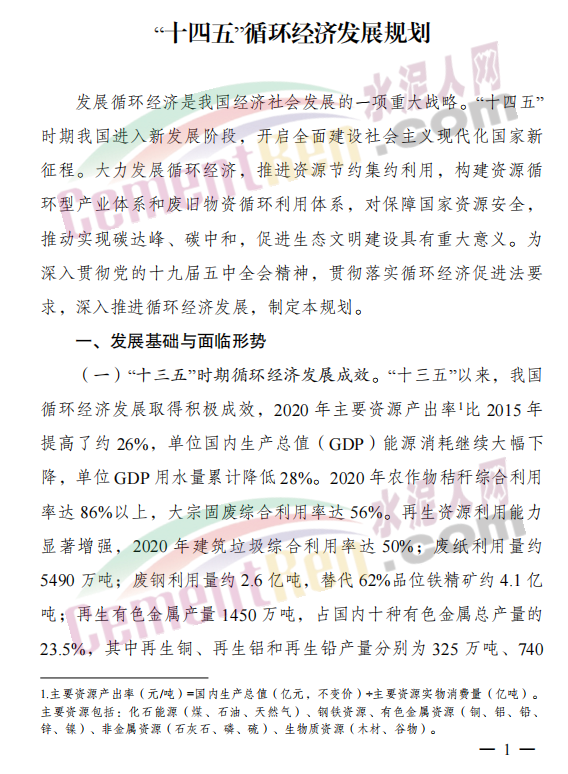 “十四五”循環(huán)經(jīng)濟(jì)發(fā)展規(guī)劃的通知