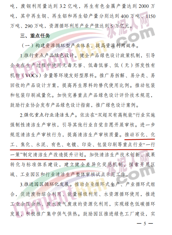 日前,發(fā)改委發(fā)布《關(guān)于印發(fā)“十四五”循環(huán)經(jīng)濟(jì)發(fā)展規(guī)劃的通知》,《通知》提到,將推動石化、化工、焦化、水泥、有色、電鍍、印染、包裝印刷等重點(diǎn)行業(yè)“一行一策”制定清潔生產(chǎn)改造提升計(jì)劃。