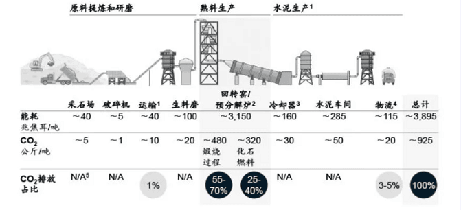水泥生產(chǎn)過程中的二氧化碳排放主要源于熟料生產(chǎn)過程,其中石灰石煅燒產(chǎn)生生石灰的過程所排放的二氧化碳,約占全生產(chǎn)過程碳排放總量的55-70%;高溫煅燒過程需要燃燒燃料,因此產(chǎn)生的二氧化碳,約占全生產(chǎn)過程碳排放總量的25-40%。