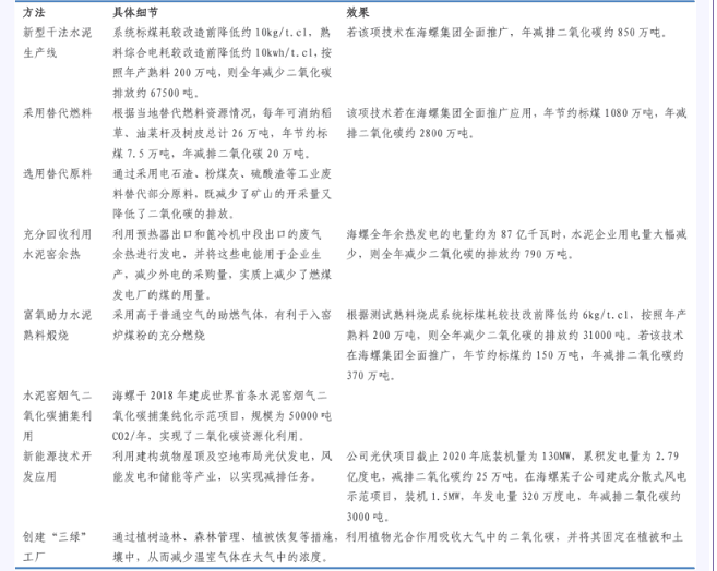 以海螺水泥為例,公司通過一系列手段降低碳排放實現(xiàn)碳中和,2020年預(yù)期將噸熟料二氧化碳排放較2016年減少0.004噸,2025年預(yù)期將噸熟料二氧化碳排放較2020年下降0.0031噸。同時引進新技術(shù)將二氧化碳廢氣轉(zhuǎn)化為二氧化碳產(chǎn)品。根據(jù)水泥網(wǎng)報道,海螺水泥通過一系列手段降低碳排放實現(xiàn)碳中和。如新型干法水泥生產(chǎn)線、富氧助力水泥熟料煅燒和水泥窯煙氣二氧化碳捕集利用等方法。其中水泥窯煙氣二氧化碳捕集利用技術(shù)擁有世界首條水泥窯煙氣二氧化碳捕集純化示范項目,規(guī)模為50000噸CO2/年,實現(xiàn)了二氧化碳資源化利用。