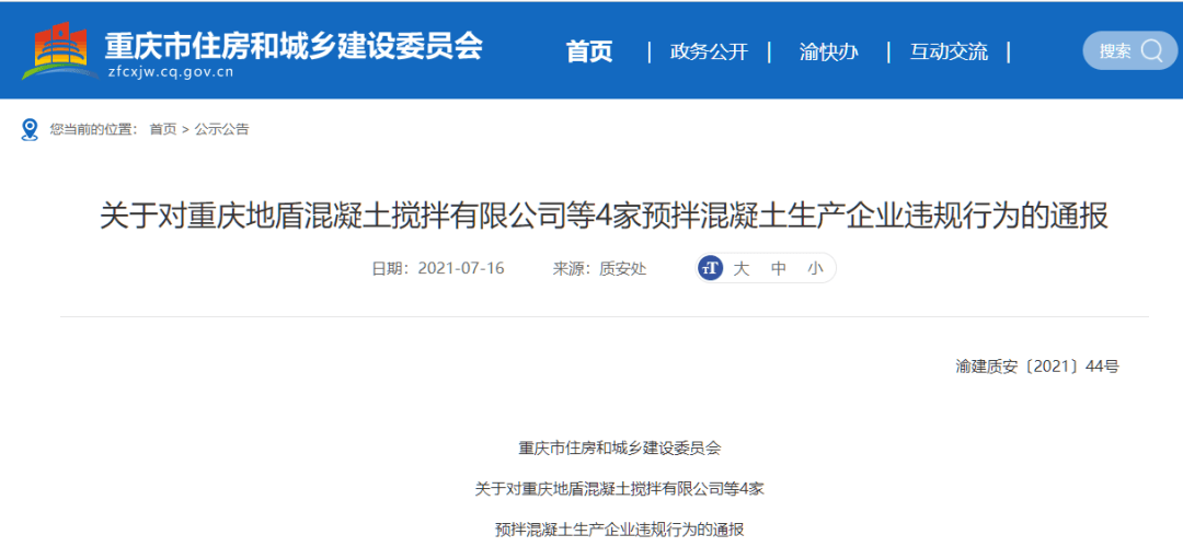 7月17日,記者從重慶市住房和城鄉(xiāng)建設(shè)委員會(huì)獲悉,該委近期對(duì)15個(gè)區(qū)縣28家預(yù)拌混凝土生產(chǎn)企業(yè)開(kāi)展了監(jiān)督抽查,抽查發(fā)現(xiàn)重慶地盾混凝土攪拌有限公司等4家預(yù)拌混凝土生產(chǎn)企業(yè)在生產(chǎn)過(guò)程中,違反質(zhì)量控制相關(guān)法律、法規(guī)和工程建設(shè)標(biāo)準(zhǔn)規(guī)定。