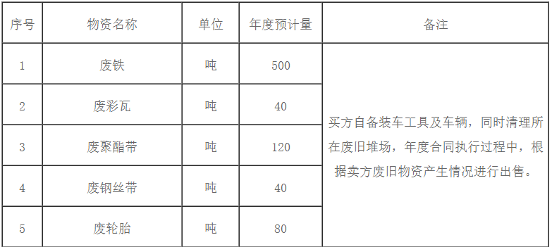 根據(jù)《廢舊物資管理辦法》,為規(guī)范公司廢舊物資出售管理,保證廢舊物資出售過程的公開、公平、公正,興業(yè)海螺計劃對2021-2022年公司內(nèi)廢舊物資進行公開招標,本次招標主要針對日常產(chǎn)生的廢舊物資以及部分廢鋼球一次性的處置出售,對年度內(nèi)技改項目大批量廢舊物資的集中處置將另行招標,歡迎具備廢舊物資回收條件的公司參加本次招標活動,現(xiàn)將有關事項公示如下: